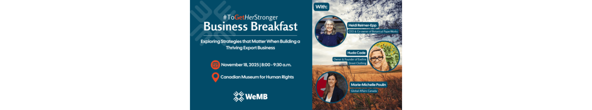 Join us on November 18 for our #ToGetHerStronger Business Breakfast, presented in partnership with Global Affairs Canada, where Heidi Reimer-Epp, CEO & Co-founder of Botanical PaperWorks and Huda Cade, owner of Eveline Street Clothing will share their successes and challenges as they’ve scaled their businesses beyond Canada, responded to shifting market demands, and adapted to new global realities.
